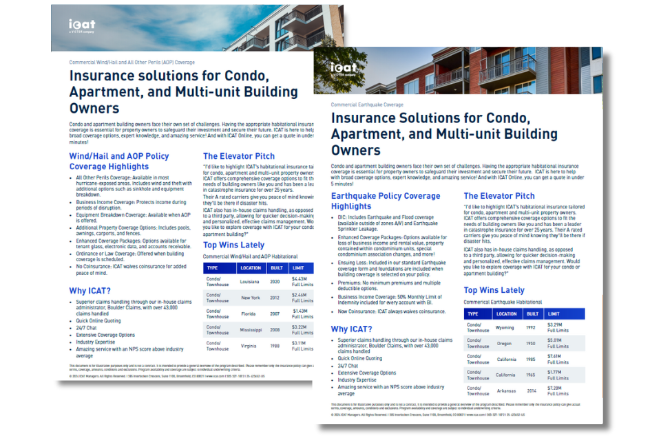 Ready to learn more about ICAT's habitational commercial insurance products? Download the highlight sheets to learn more about ICAT's commercial wind and commercial earthquake coverage. Included is a handy elevator pitch, recent hits, and more.