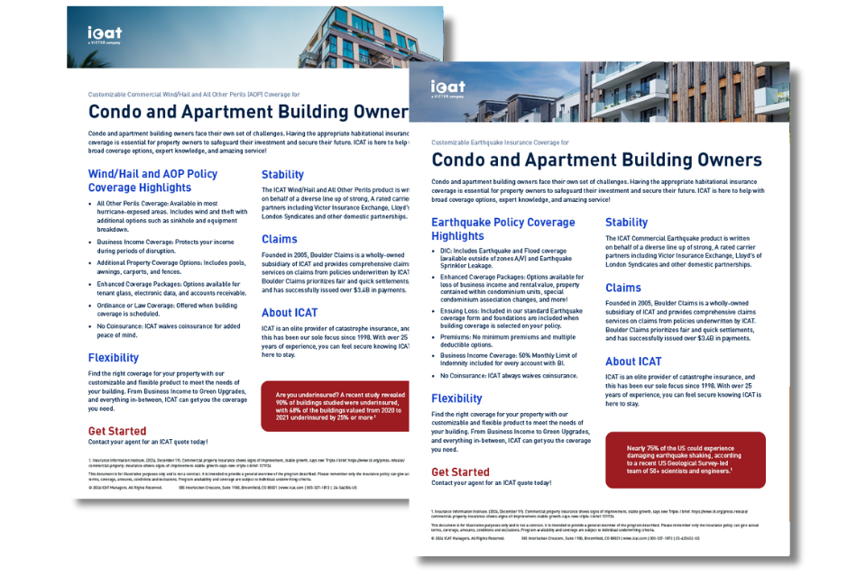 ICAT has developed the Navigating Property Insurance for Condos and Apartments guides to help building owners and association boards navigate the complexities of insurance coverage in hurricane-prone and earthquake-prone regions. Download yours today to share with your clients!