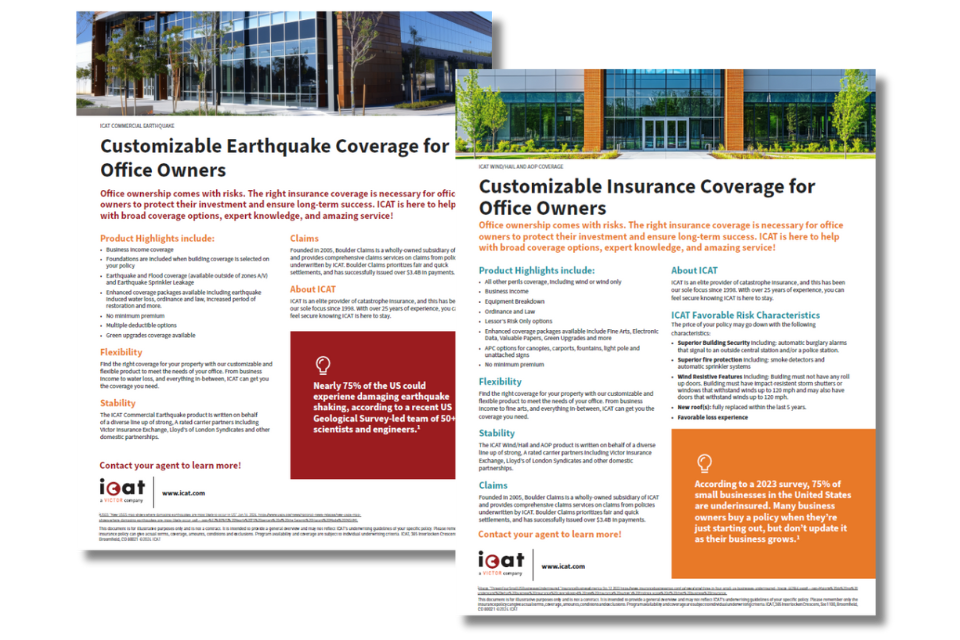 Office ownership comes with risks. The right insurance coverage is necessary for office owners to protect their investments and ensure long-term success. ICAT is here to help with Earthquake, Wind, and AOP solutions.